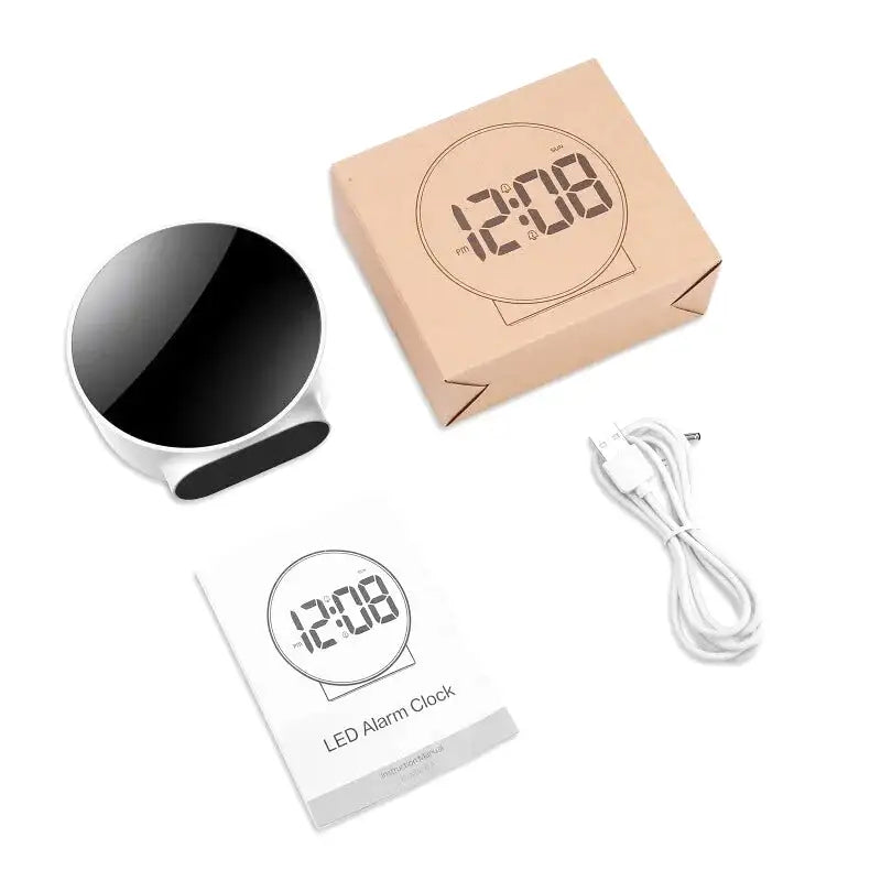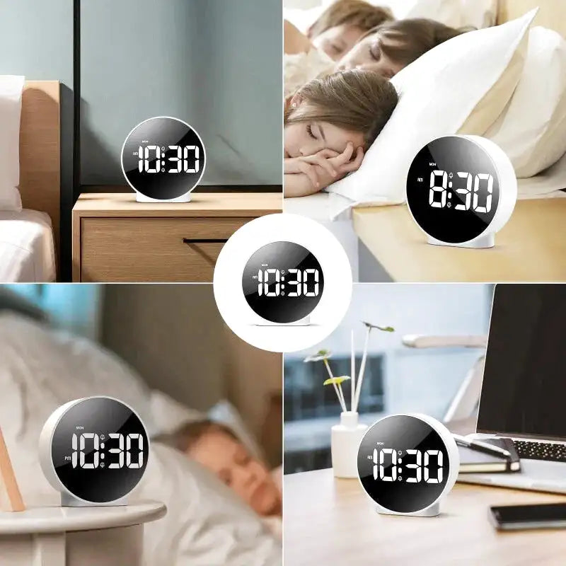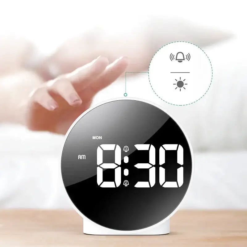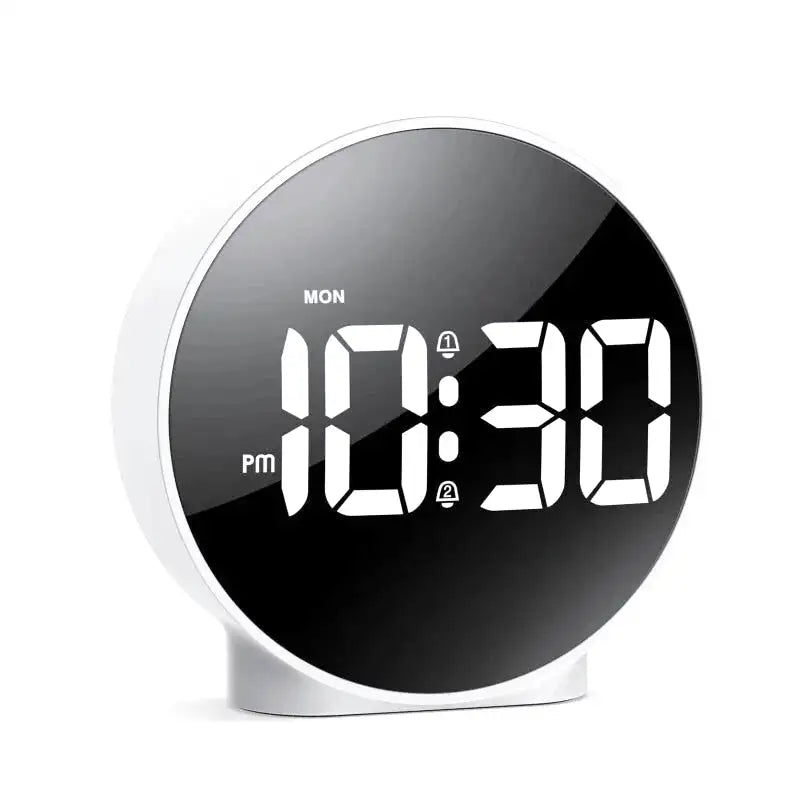 Réveil digital rond argenté à gros chiffres blancs