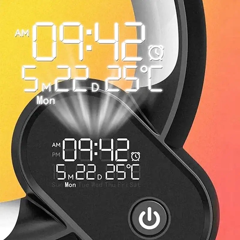 Le design circulaire noir, moderne et sobre, s’intègre facilement dans toute chambre. Son affichage numérique clair reste parfaitement lisible même en pleine nuit, tandis que les commandes tactiles discrètes vous permettent de régler l’heure ou l’ambiance sans effort. Chaque détail a été pensé pour offrir une expérience fluide et agréable, alliant esthétique raffinée et confort d’utilisation. Le résultat ? Un réveil aussi beau que pratique, qui rehausse votre espace de nuit.